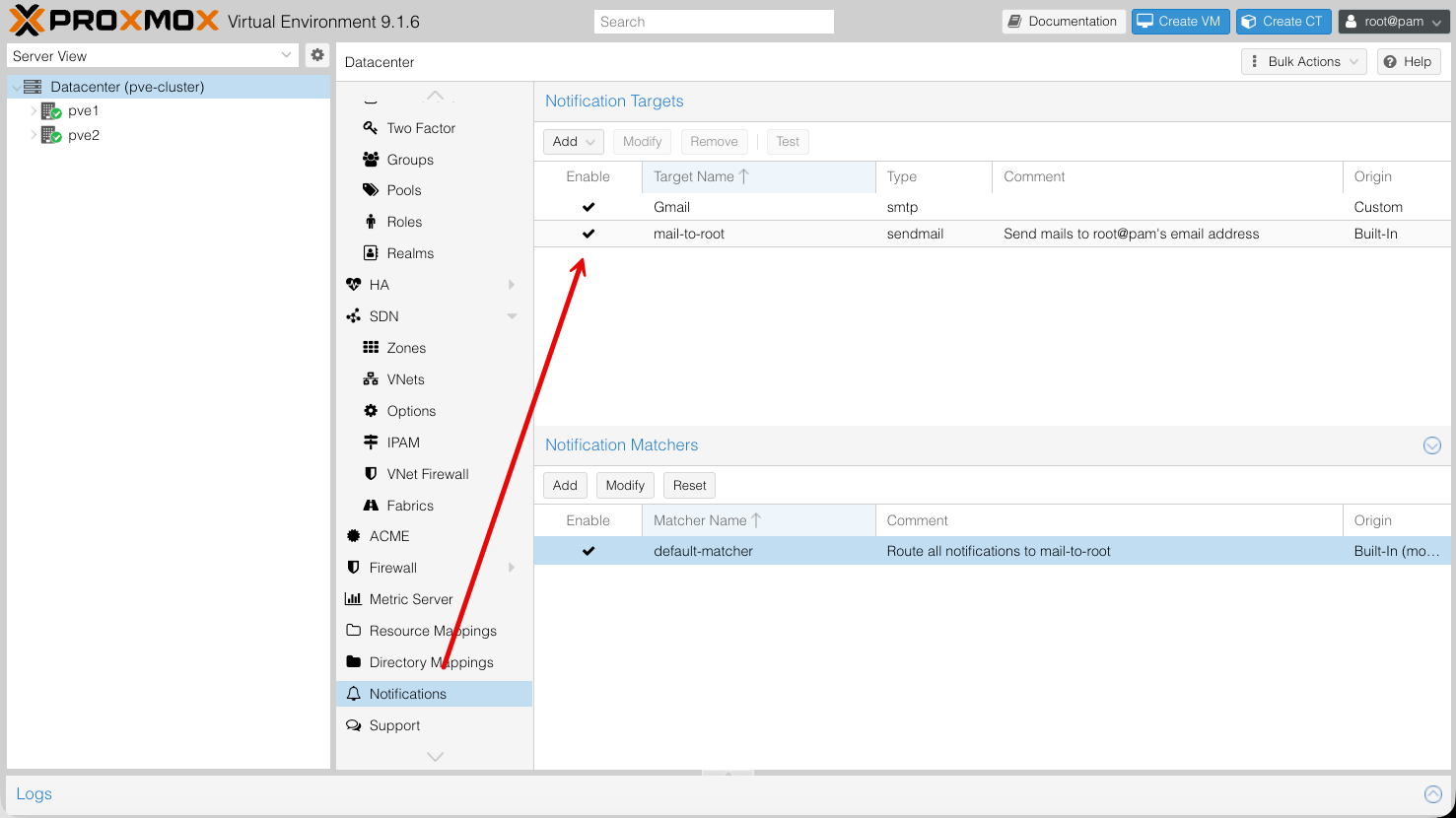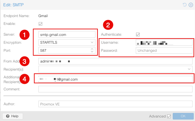 Published: 3/1/2026 Proxmox Email Notifications System Administration Proxmox Email Notifications From the Datacenter, Click on Notifications and add a Notification TargetStep 1 – Generate Google App PasswordLogin to Google WorkspaceGo to Google Account → SecurityEnable 2-Step VerificationOpen App PasswordsCreate password for Mail / Other (Oracle Linux)Copy the generated 16-character passwordStep 2 – Create a Notification TargetCreate a new Notification(1) Provider server information (Google) use Encryption: STARTTLS and Port: 587(2) Username: Email for the App Password request and Generated Password from Google (3) From Address: Is the email that will be receiving notifications(4) Additional Recipients: Is the email for the user(s) that will be receiving email notificationsStep 3 – Notification WatcherClick on “Targets to Notify”Change the target from “mail-to-root” to “Gmail”Step 4 – Test EmailClick on the Test buttonCheck your email inbox
